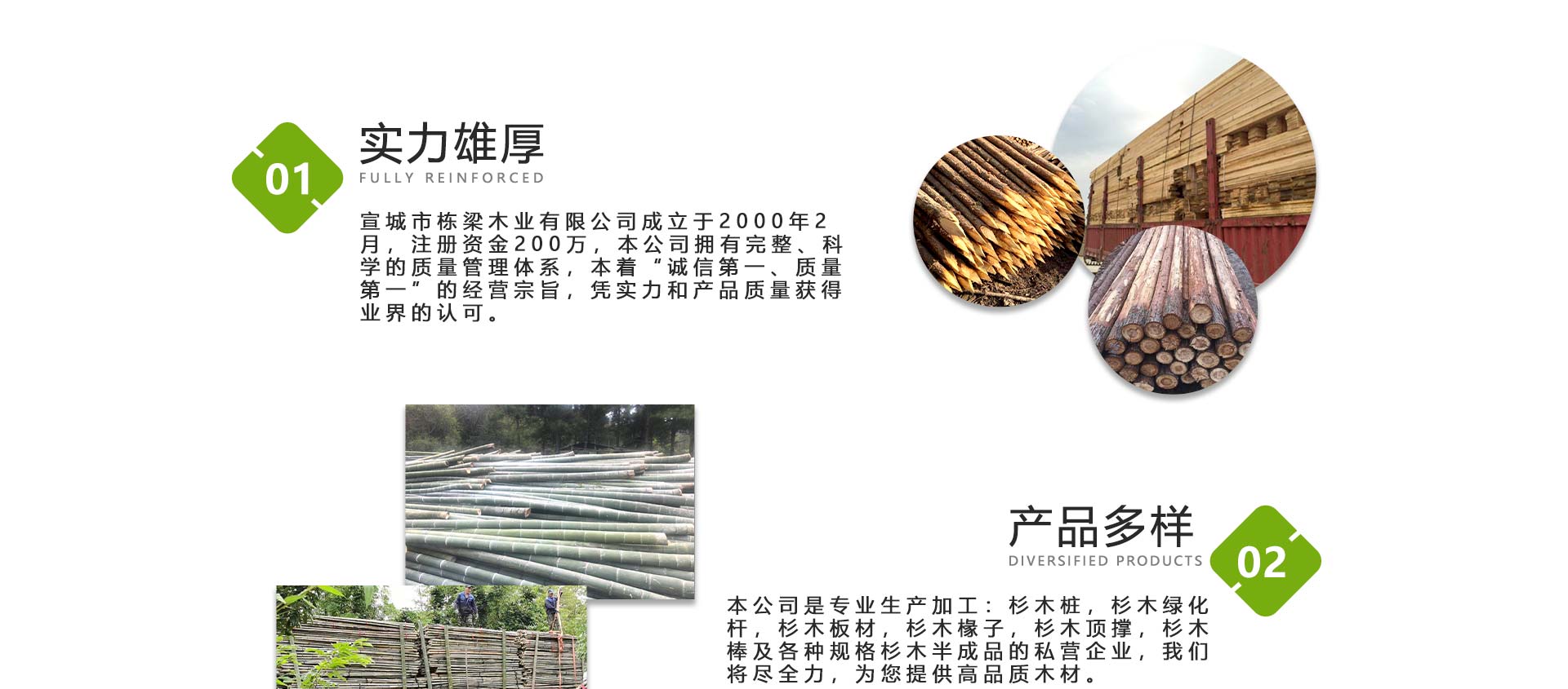 關(guān)于我們宣城市棟梁木業(yè)有限公司成立于2000年2月,注冊(cè)資金200萬(wàn),是專(zhuān)業(yè)生產(chǎn)加工:杉木樁,杉木綠化桿,杉木板材,杉木椽子,杉木頂撐,杉木棒及各種規(guī)格杉木半成品的私營(yíng)企業(yè),本公司擁有完整、科學(xué)的質(zhì)量管理體系,本著“誠(chéng)信為先、質(zhì)量保證”的經(jīng)營(yíng)宗旨,憑實(shí)力和產(chǎn)品質(zhì)量獲得業(yè)界的認(rèn)可。歡迎各界朋友蒞臨本公司參觀(guān)、指導(dǎo)和業(yè)務(wù)洽談。